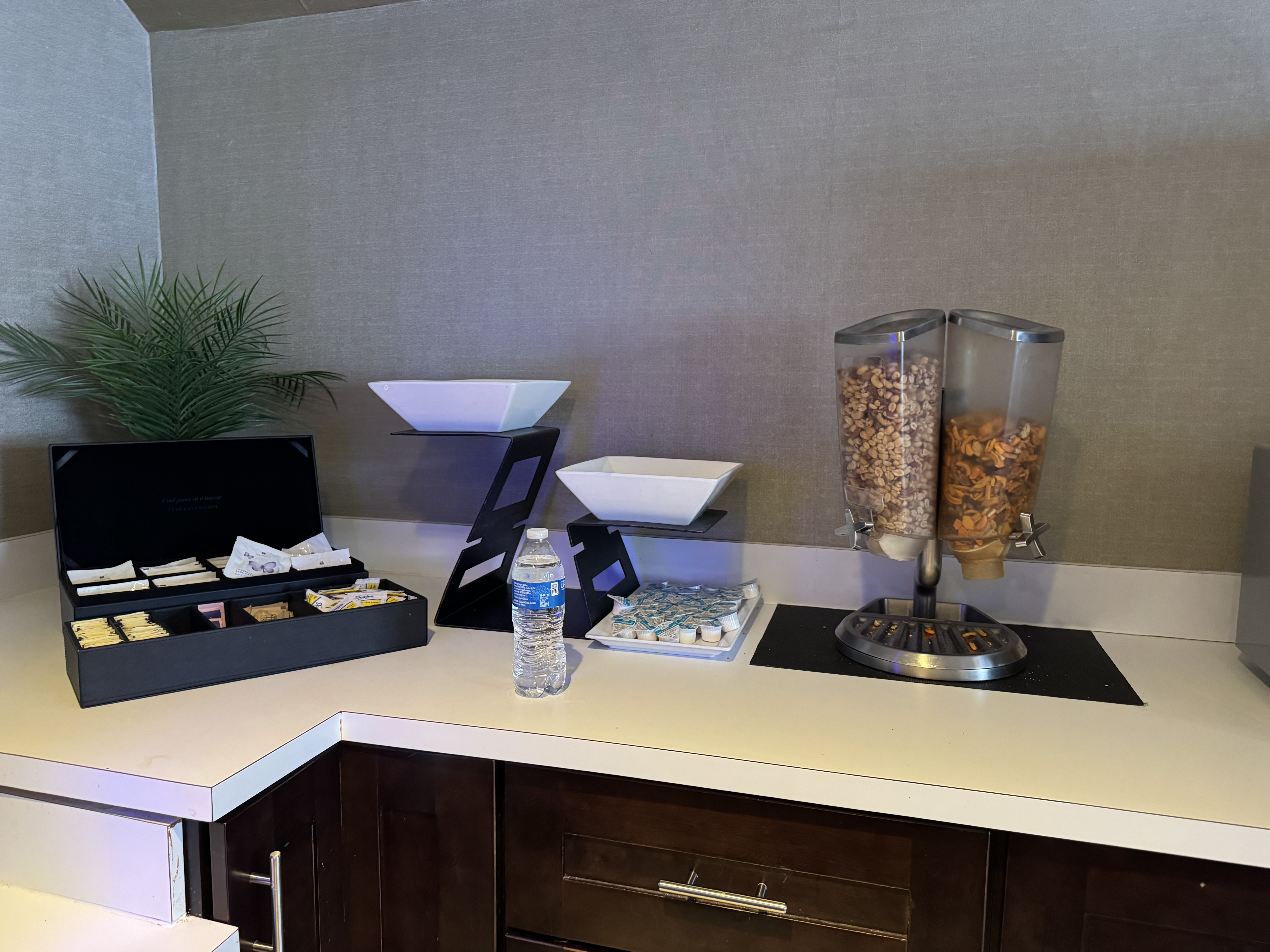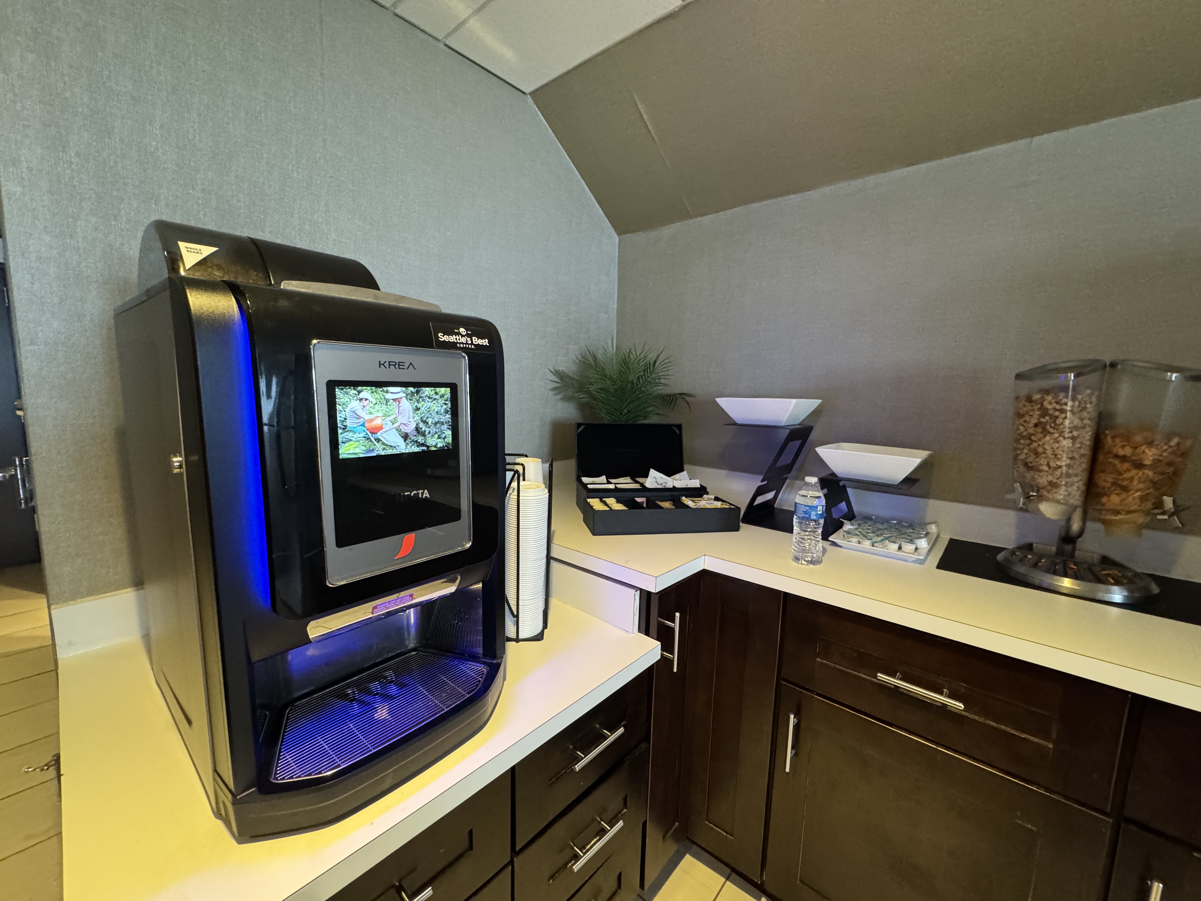 Inside the lounge, there was a coffee machine, tea, snacks, soda, and water available. There was also a microwave, so you could heat up simple meals.
