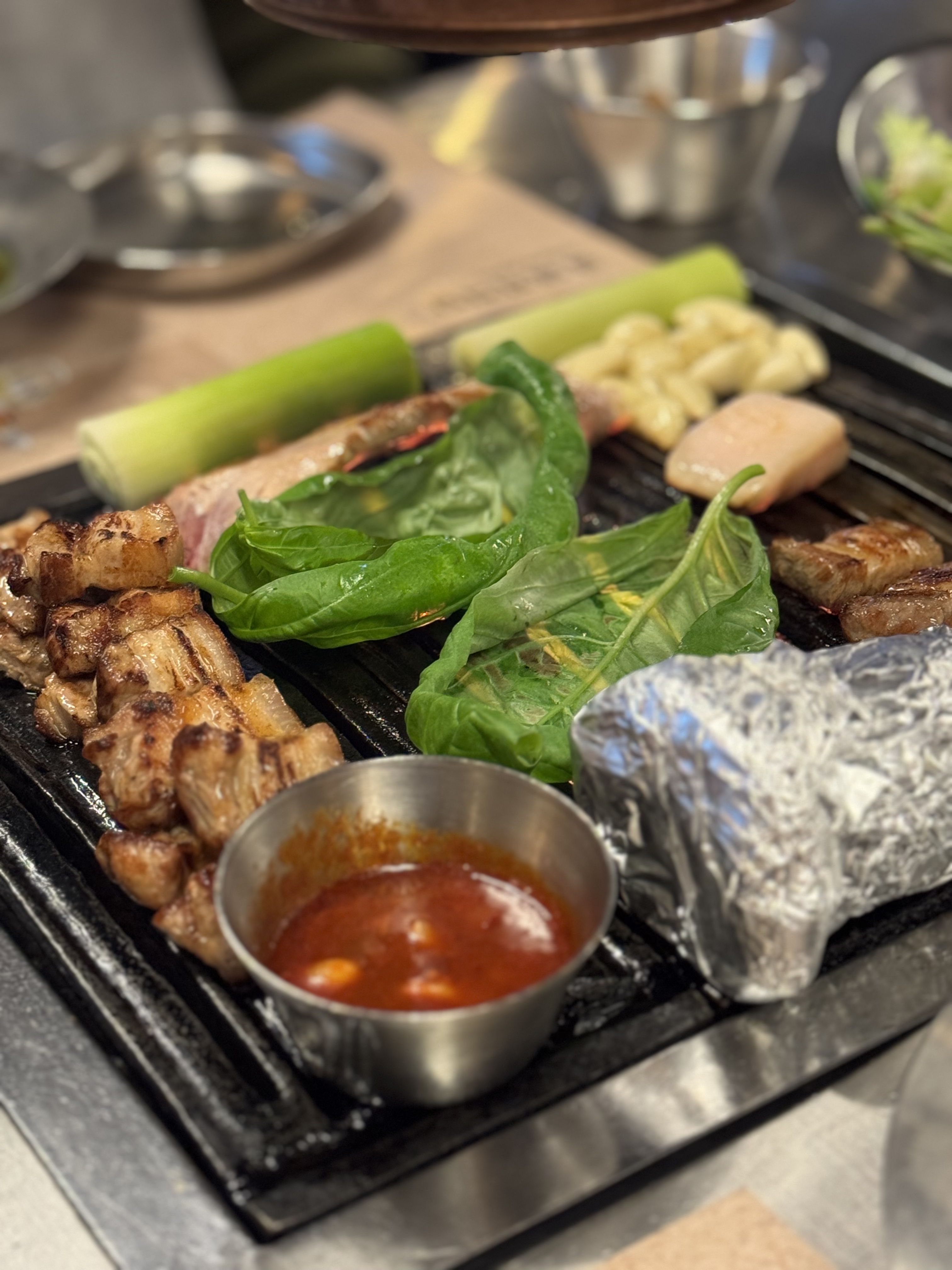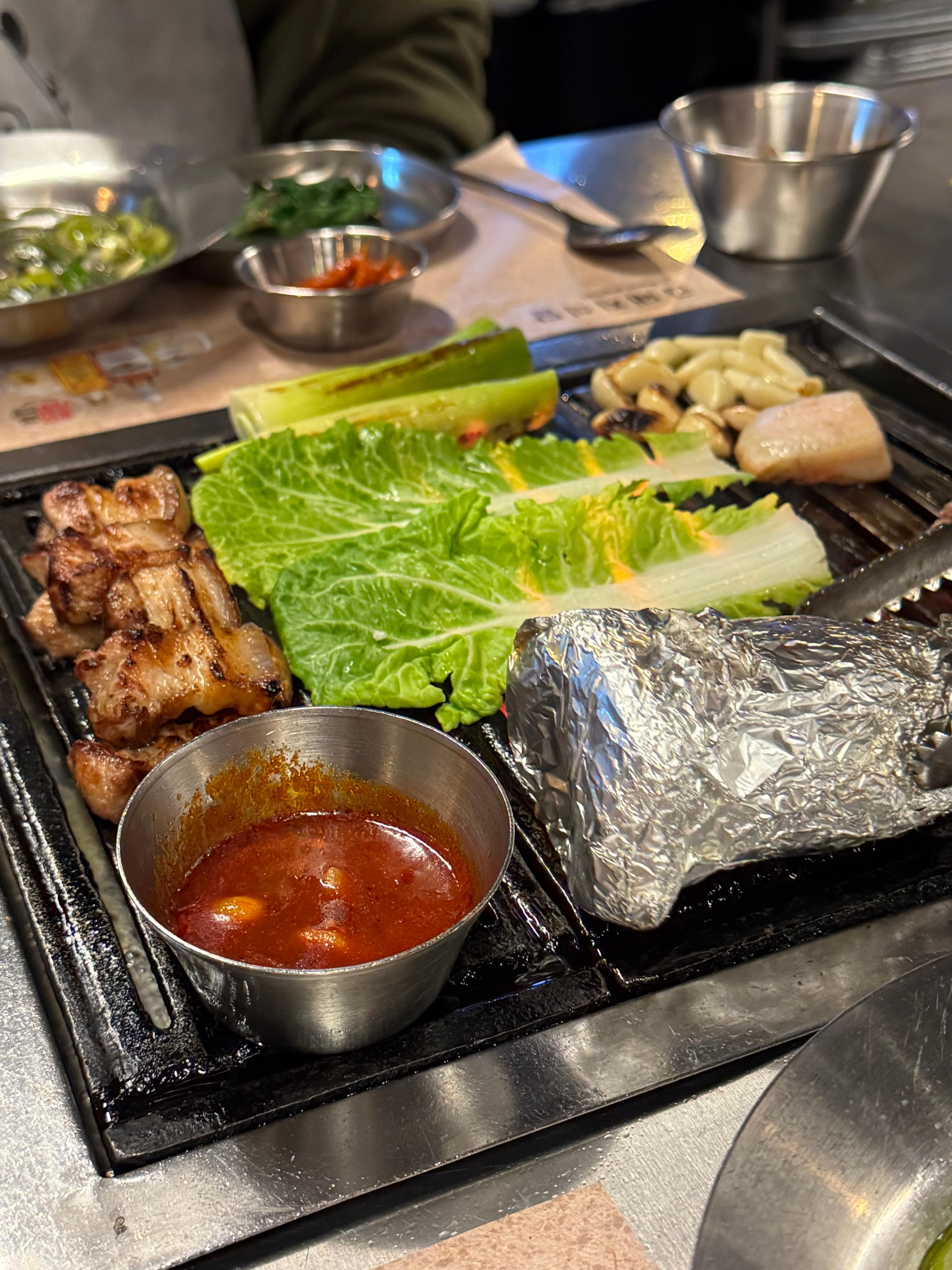 We first ordered the bone-in pork belly, which must be ordered for at least two portions. It came with mushrooms wrapped in foil, garlic, and green onions.