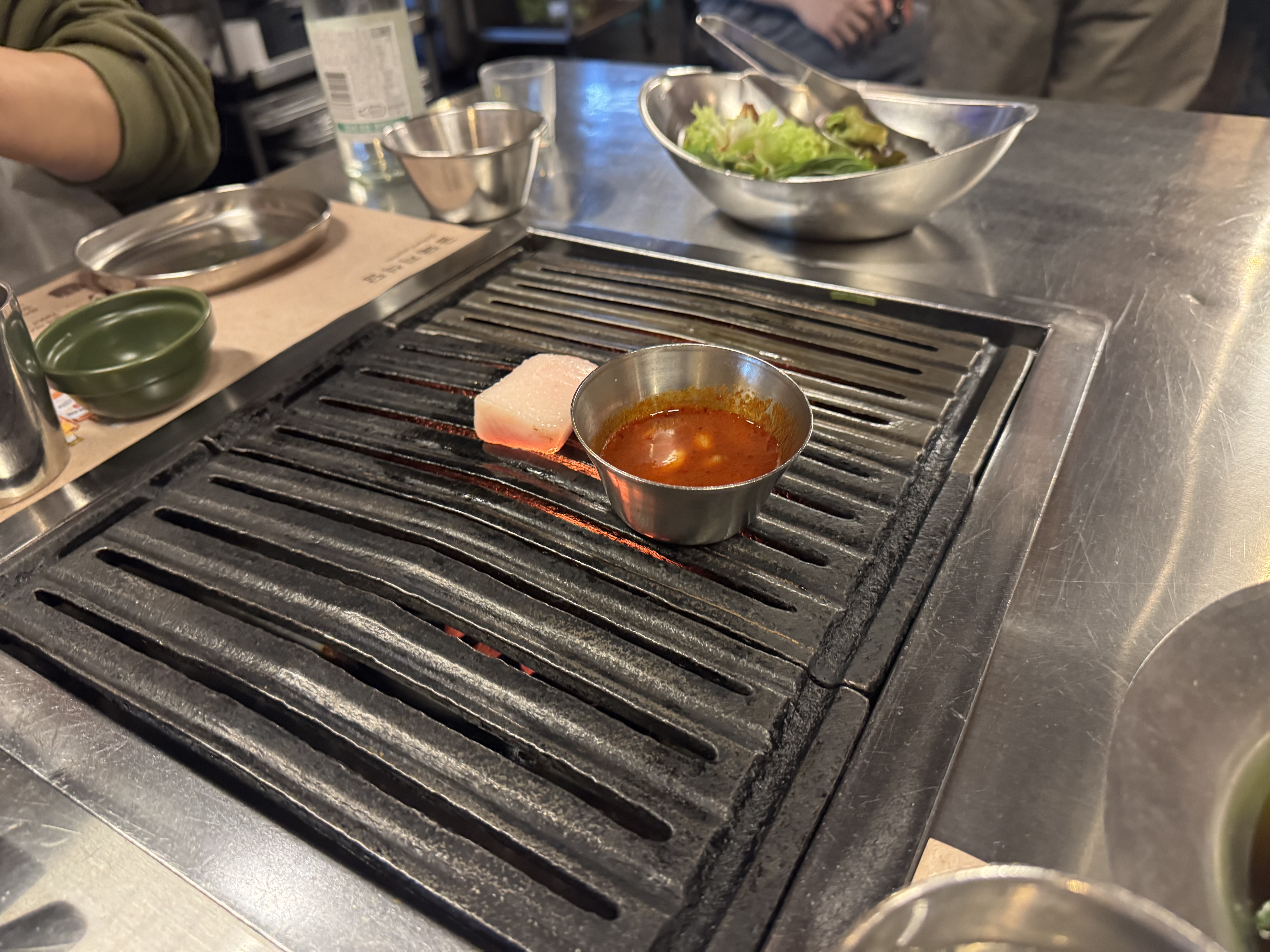 On the grill, they place pork fat to grease the pan and meljeot (anchovy sauce), which is commonly used as a dipping sauce for pork in Korea.