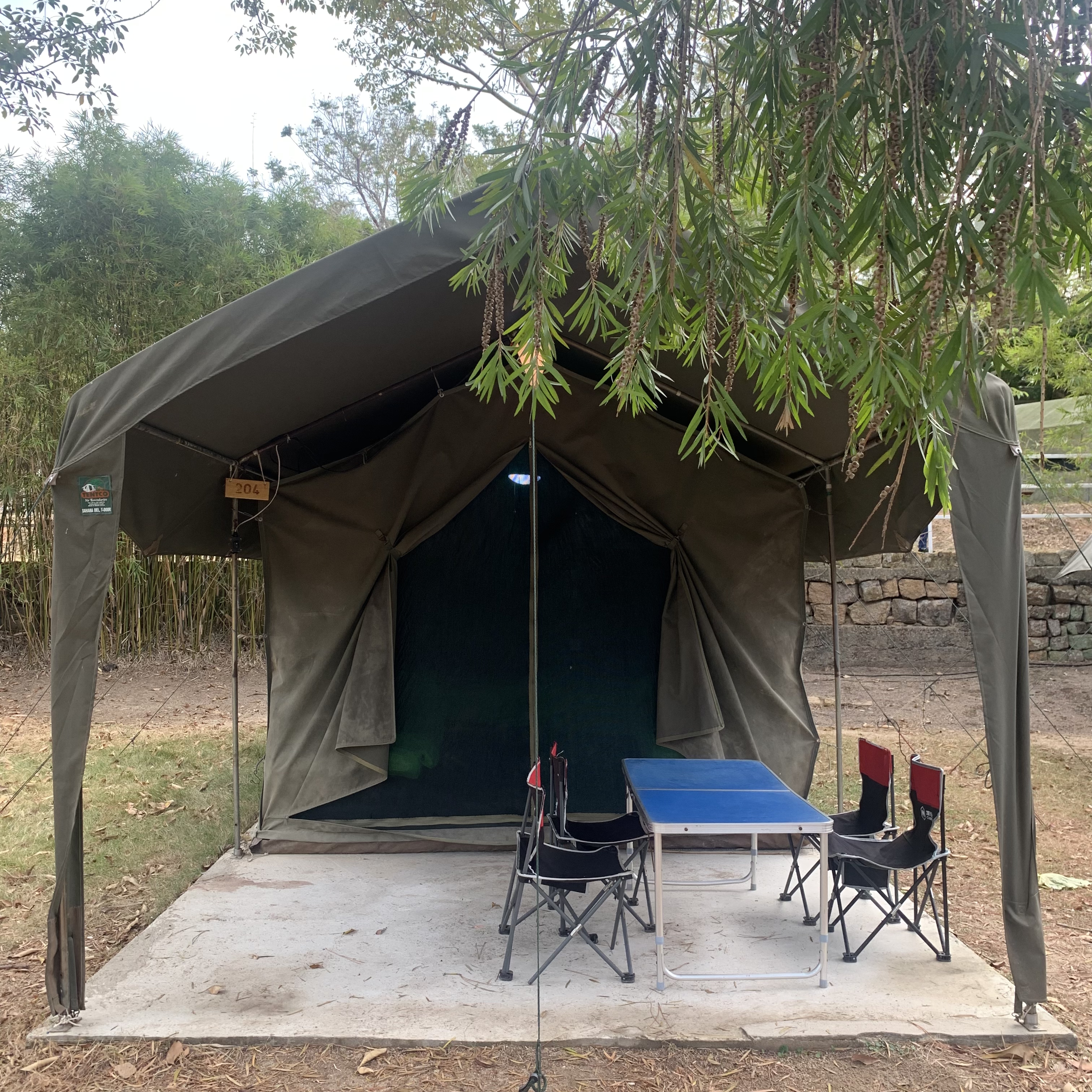 Inside the tent you will find: Sleeping beds, Air conditioning, USB charging ports. Outside the tent, there is also a table and four chairs.