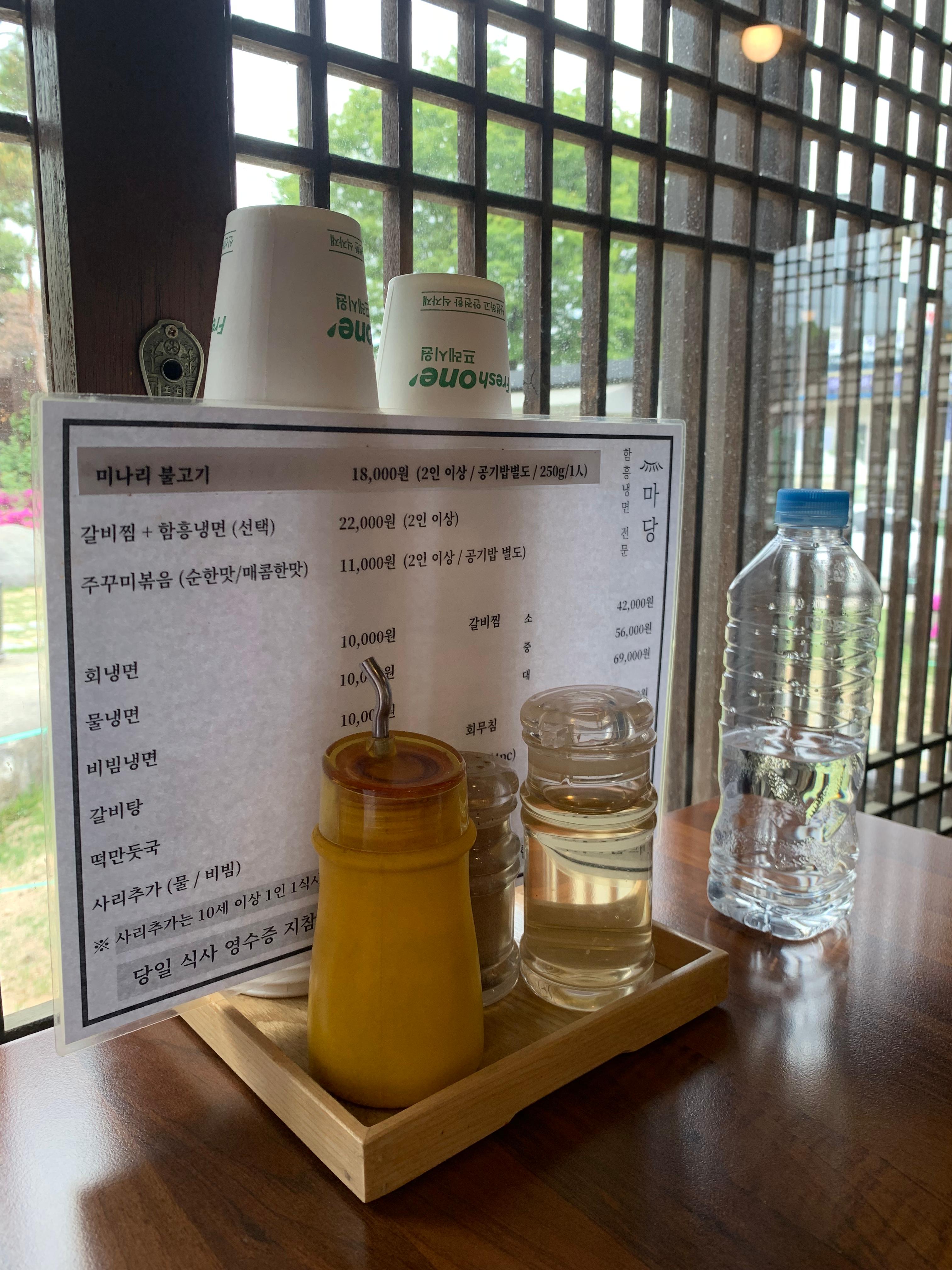 On the table you’ll find the menu along with bottled water, vinegar, mustard, and pepper for seasoning the noodles to your preference. Water is served in 500ml bottles, and paper cups are provided. Water is free In Korea.