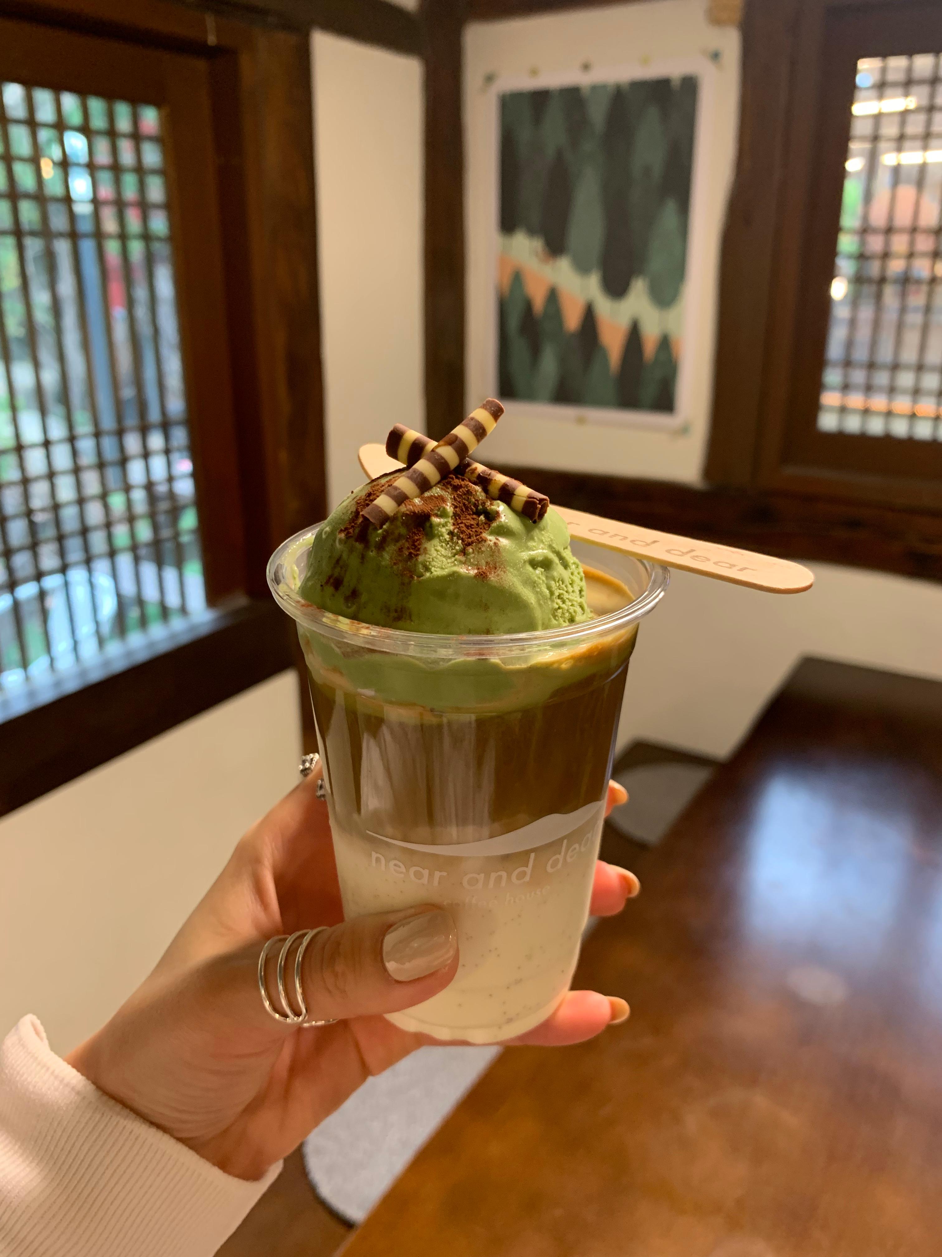 The green tea affogato combines matcha ice cream with espresso, topped with cocoa powder and chocolate. It costs 6,500 KRW.