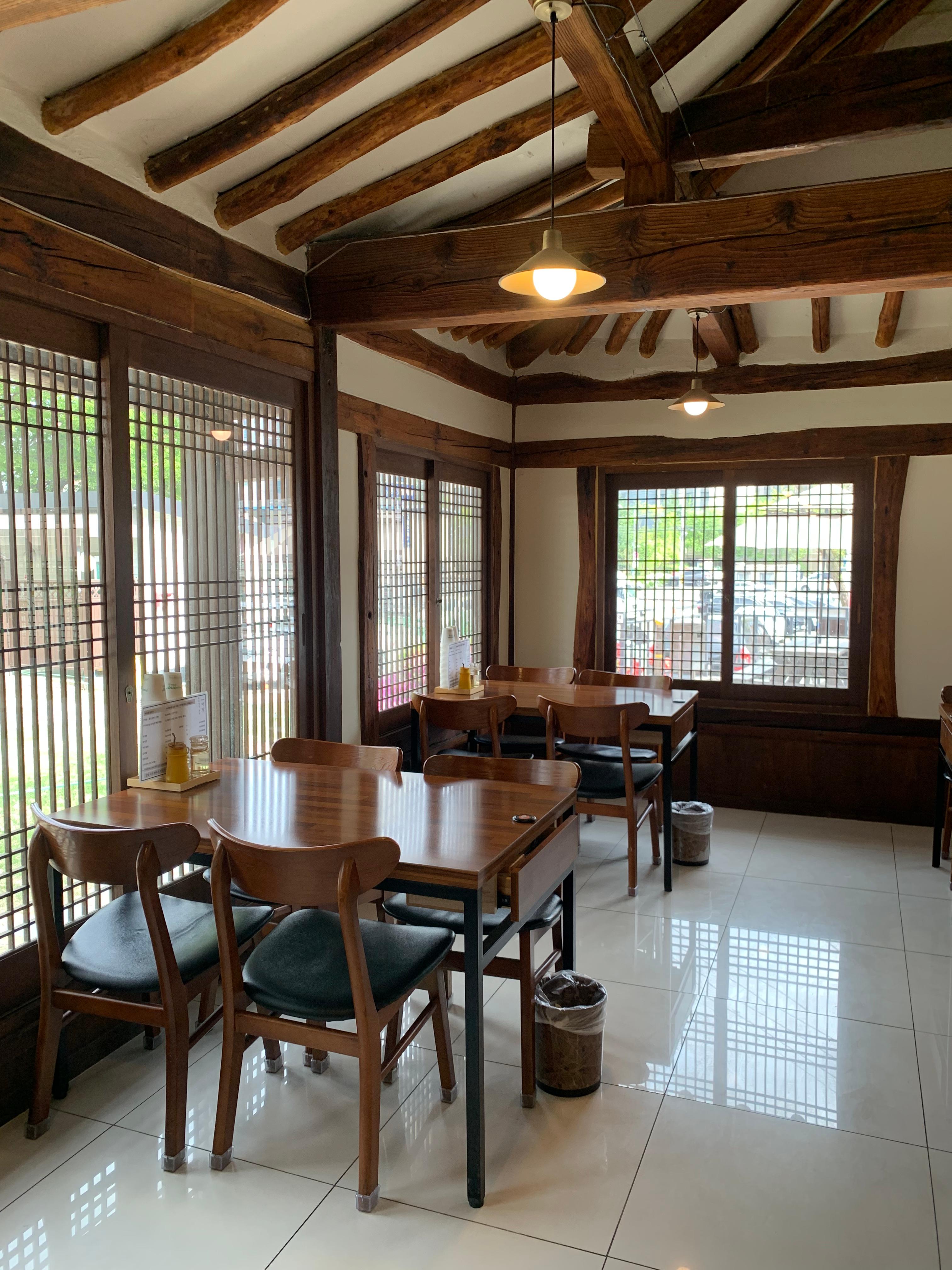 I chose a seat near the window, where traditional hanok-style windows add to the atmosphere. From the window you