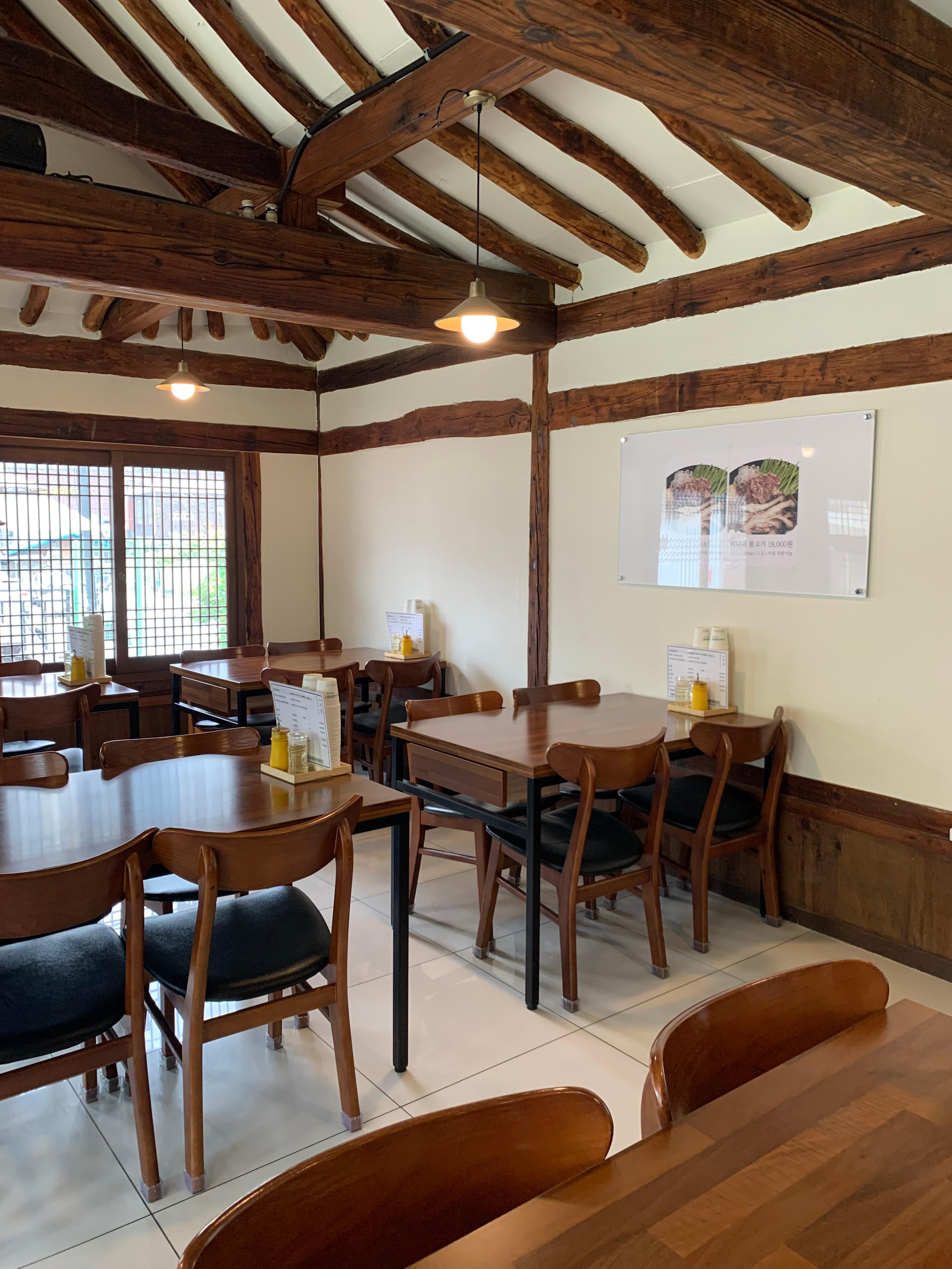 Inside, the exposed wooden rafters give the dining room a classic Korean architectural feel. One small detail I liked was that each table had its own small trash bin, which made the table more convenient to use.